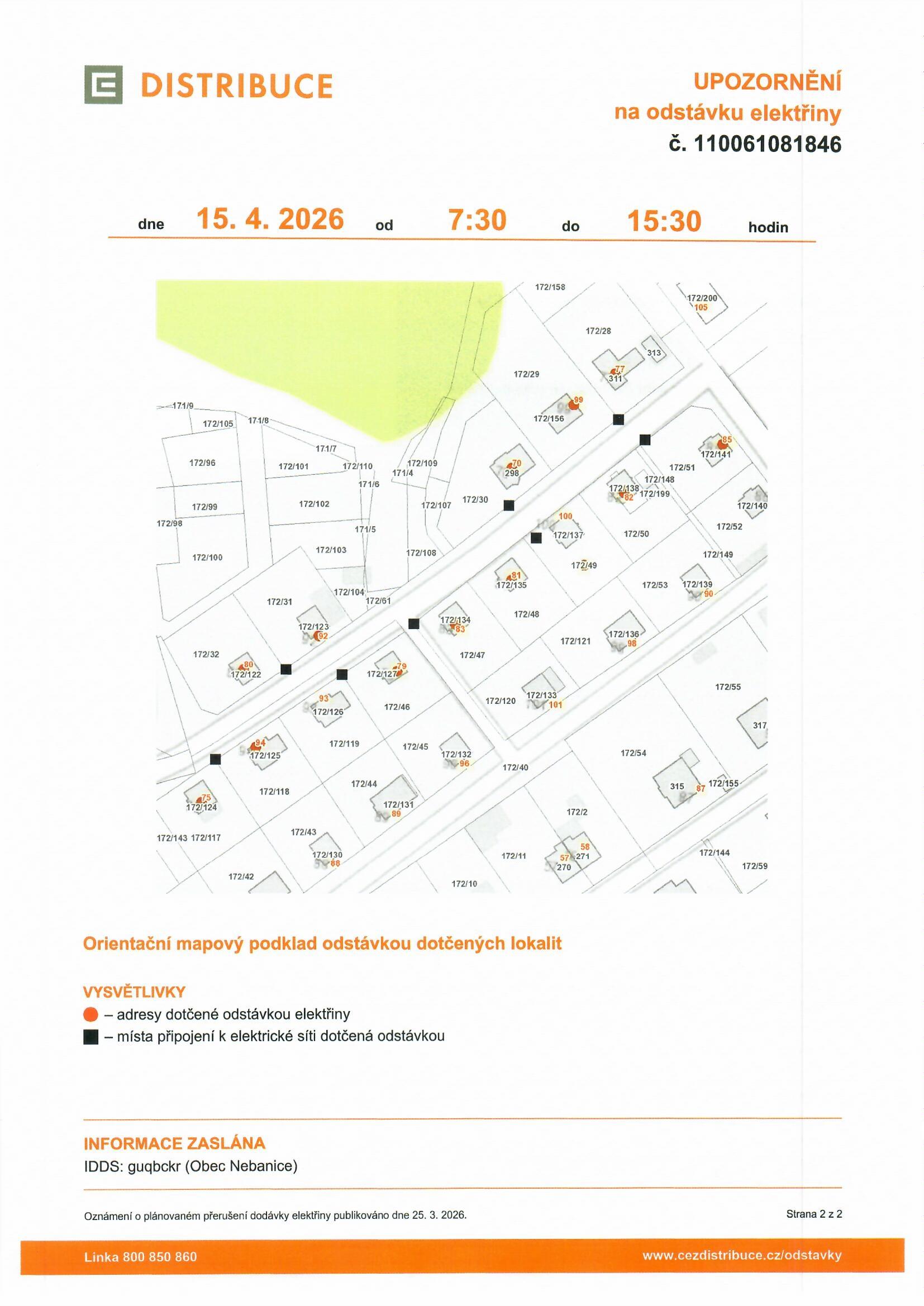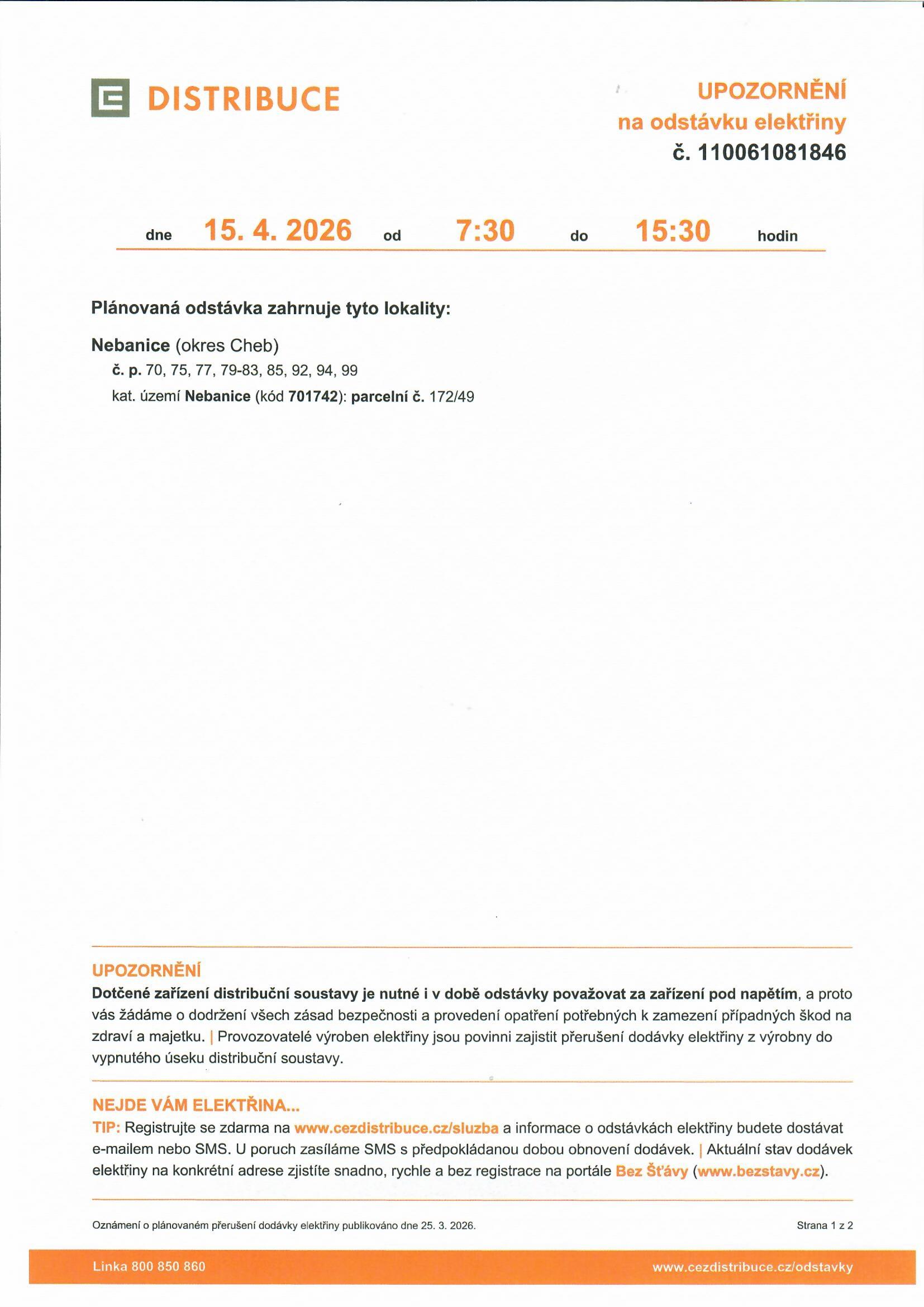 Dne 15. dubna 2026 dojde k plánované odstávce elektřiny v Nebanicích, v okrese Cheb, od 7:30 do 15:30 hodin. Dotčeny budou konkrétní objekty na parcelních číslech 70, 75, 77, 79-83, 85, 92, 94 a 99. Upozorňujeme, že zařízení distribuční soustavy zůstávají pod napětím, a proto je nutné dodržovat bezpečnostní opatření. Pro aktuální informace o dodávkách elektřiny se můžete registrovat na portálu CEZ nebo Bez Šťávy.